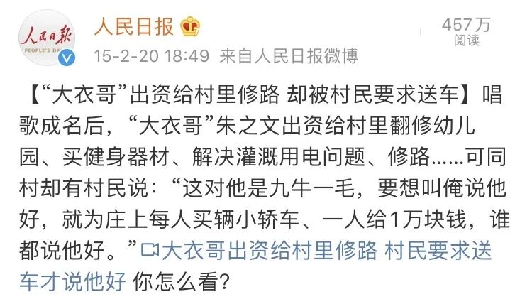 @问心阁 大衣哥成名后,为村子也做了不少好事,但村民不但没有感激,反而觉得是应该的,是理所当然的。